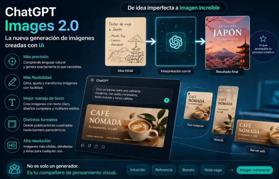 ChatGPT Images 2.0 se presenta como una evolución clara del generador de imágenes integrado en ChatGPT. La propuesta oficial gira alrededor de una idea muy concreta: crear y editar imágenes a partir de lenguaje natural, con más precisión, más flexibilidad y mejor manejo de composiciones complejas, incluyendo piezas con bastante texto, distintos formatos y resultados en alta resolución. OpenAI lo presentó el 21 de abril de 2026, y tanto la página de lanzamiento como las landings de producto insisten en ese salto hacia una generación más útil en casos reales.