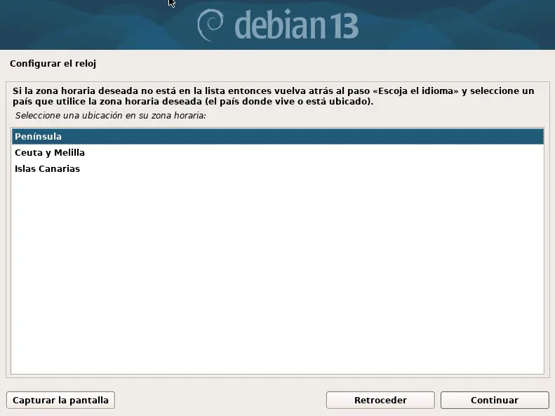 El instalador de Debian permite seleccionar idioma, teclado y zona horaria desde el inicio, lo que ajusta la configuración regional y los formatos de fecha/hora.