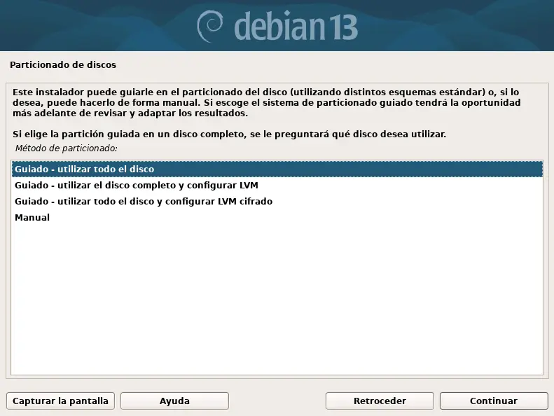 - Manual: Ideal para usuarios avanzados que desean configurar particiones /home, /var, /boot, etc.