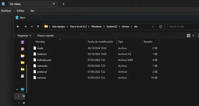 y selecciona el archivo “hosts” (es posible que debas elegir la opción “Todos los archivos” en el explorador de archivos). - Añade una nueva línea con la IP y el dominio que deseas redirigir, separándolos por un espacio. Por ejemplo,