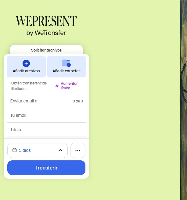 Inserción de experiencia (2): cuando tengo prisa, WeTransfer me salva porque no me obliga a registrarme ni a “dar mil permisos”; literalmente subo, copio el enlace y me voy.